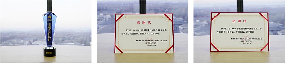 2021年,万学在高校毕业生就业工作方面贡献卓越,获教育部颁发“卓越合作伙伴”荣誉奖杯,并为天空体育董事长张锐、执行总裁张强颁发感谢状。