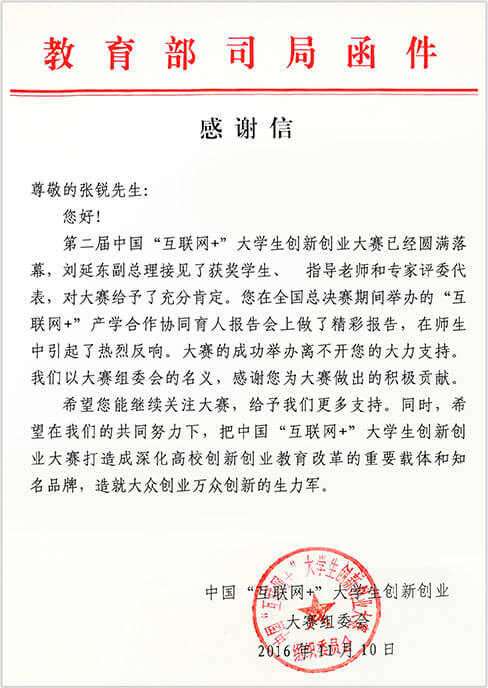 • 2018年,天空体育连续多年为中国国际互联网+大学生创新创业大赛做出积极贡献,获教育部来函致谢。